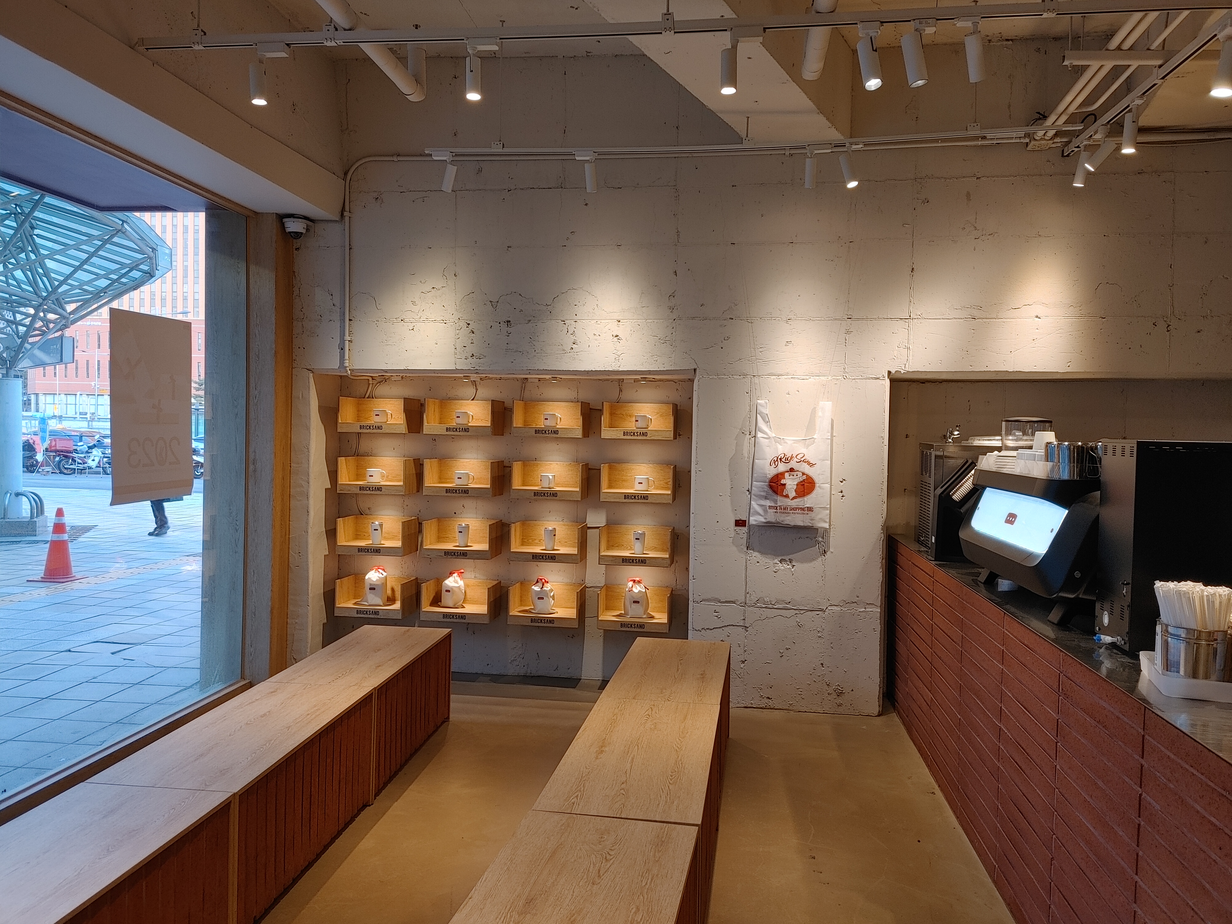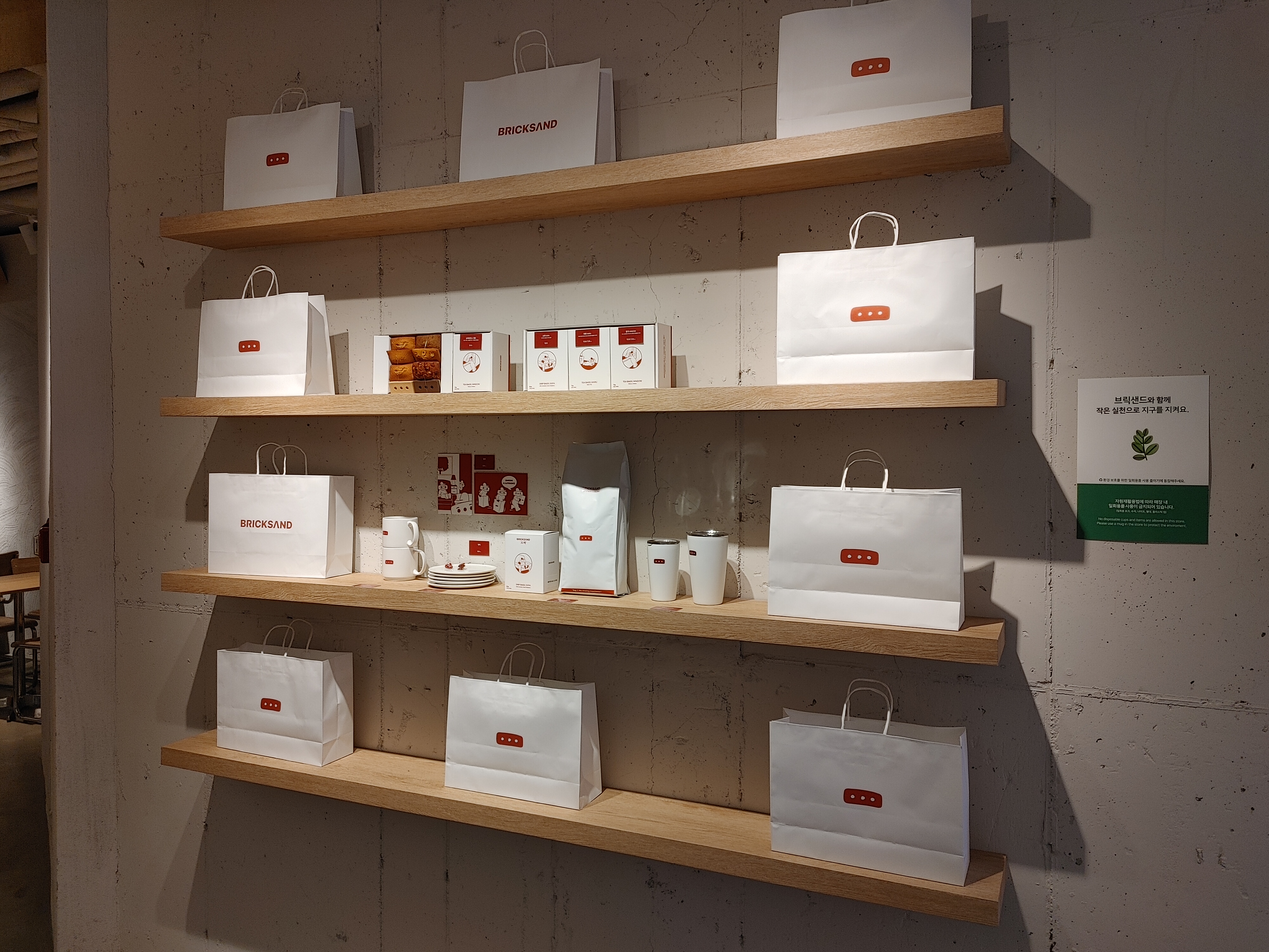 주문을 하고 포장해 주길 기다리면서 매장을 구경했다. 컵, 텀블러, 원두 등도 판매하고 있었다. 브릭샌드 로고가 왠지 유튜브 로고와 닮은 느낌.ㅎㅎ