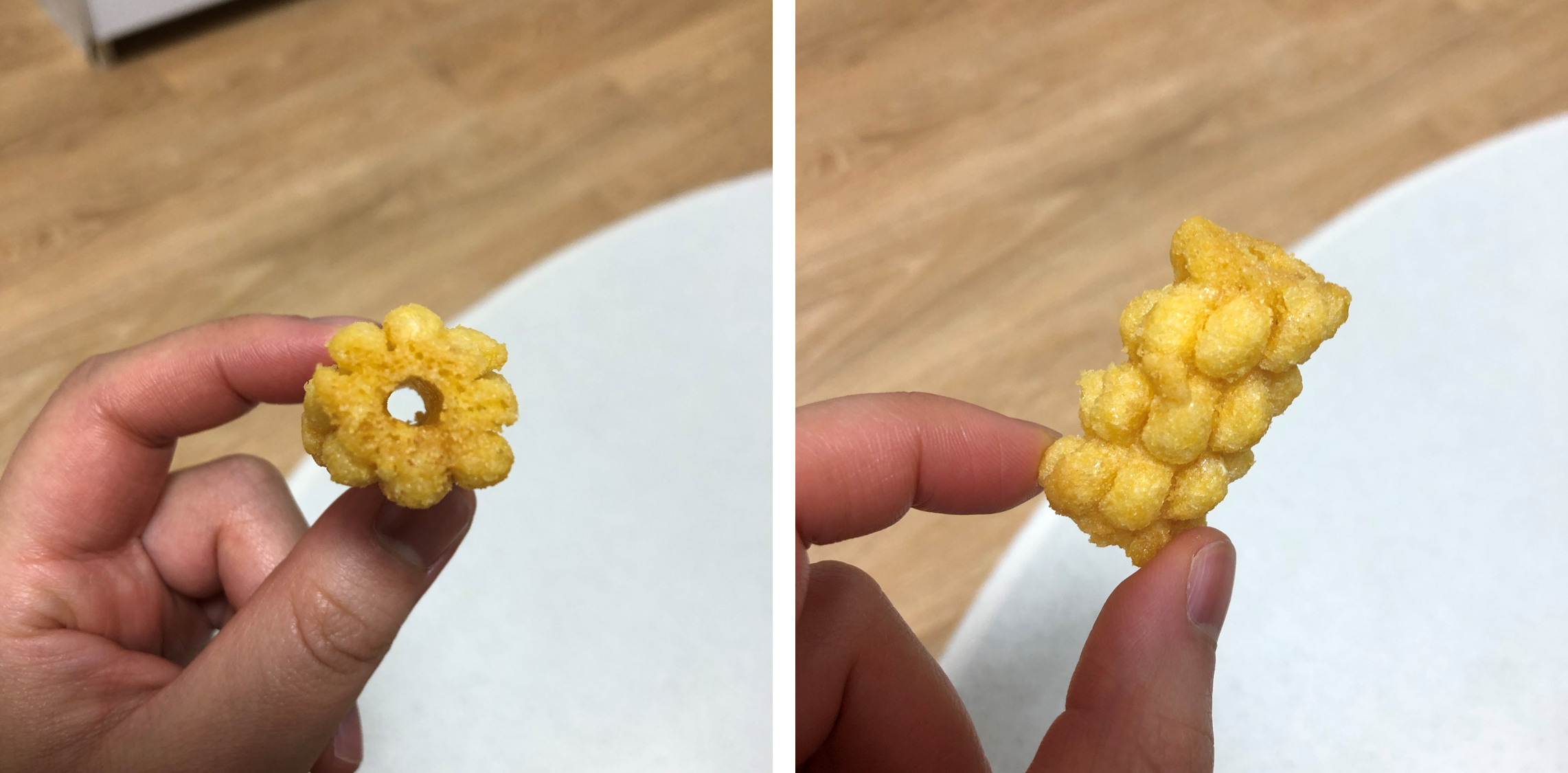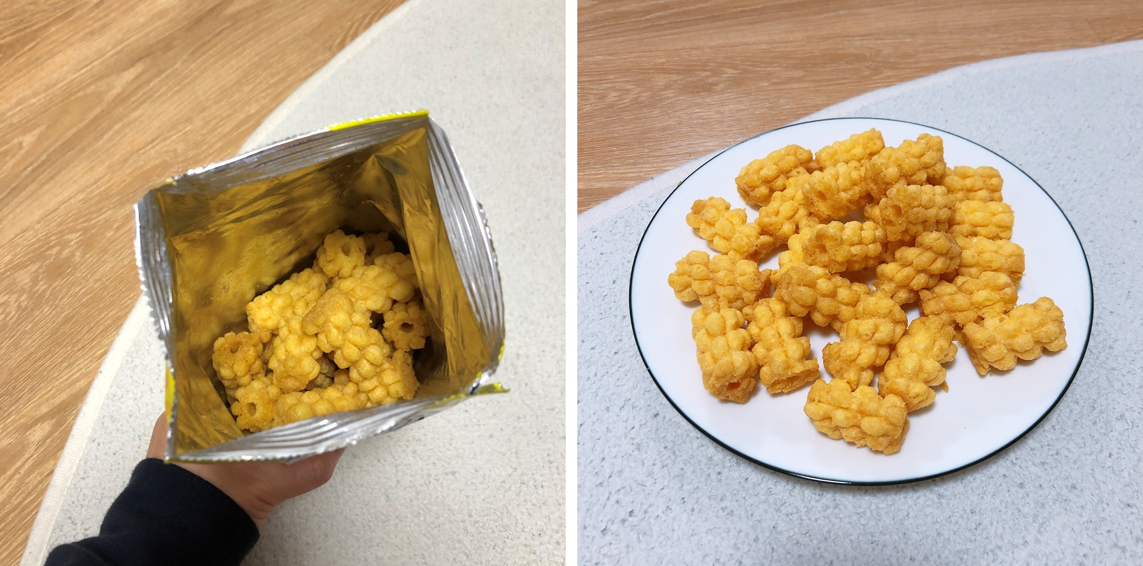 옥수수깡 과자는 옥수수 모양을 비슷하게 본떠 만들어졌다. 색상도 노랑노랑 하다. 옥수수 알갱이처럼 한 알 한 알 표현되어 있었다. 속은 뚫려 있었고 과자는 상당히 가볍고 바삭바삭했다. 맛은 일반적인 콘수프 맛 과자들을 떠올리면 될 것 같다. 내 입맛에는 너무 잘 맞았다. 고소하고 짭조름한 것이 아주 당기는 맛이었다. 밤에 간맥(간단한 맥주 한 잔)하기 아주 좋은 안주인 것 같다.