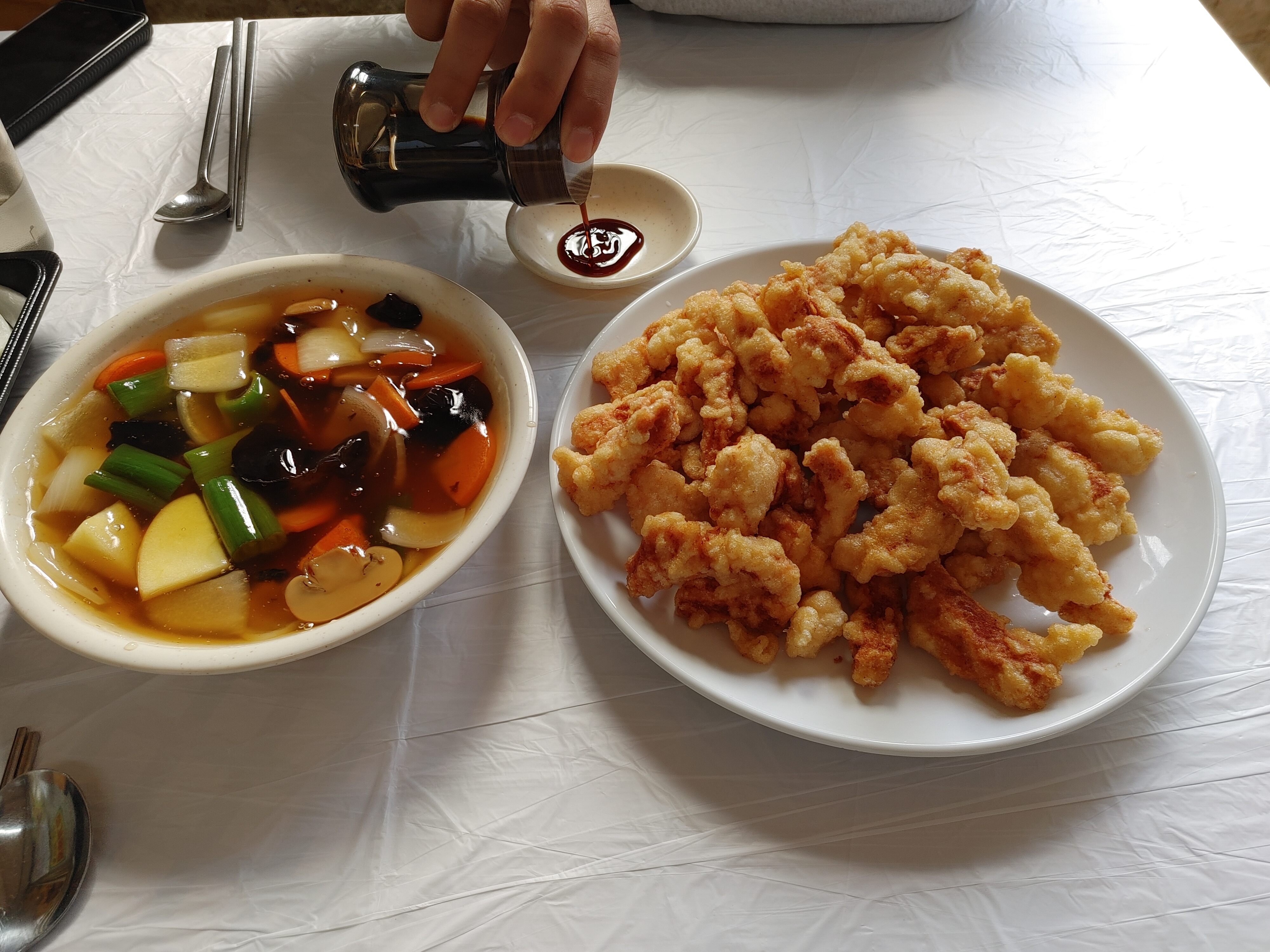 소스는 상당히 달짝지근했다. 그래서 탕수육에 탕수육 소스 찍고 간장+고춧가룻를 더한 소스를 찍으면 딱이었다. 탕수육은 양도 많고 맛도 좋았다.
