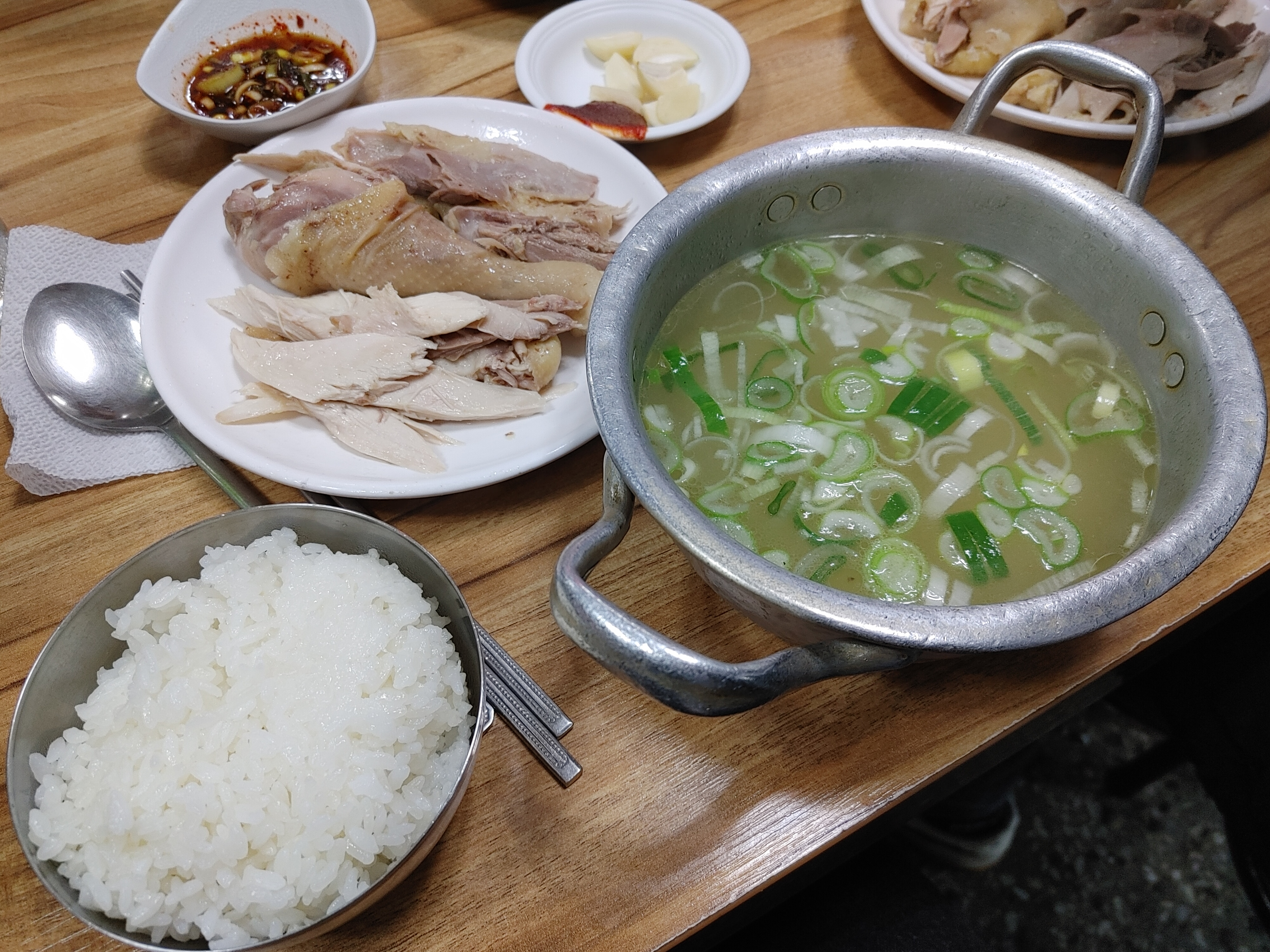 남대문시장 안에 있는 '닭진미 강원집'은 항상 웨이팅을 해야 하는 맛집이다. 사진 속 주문한 메뉴는 고기백반으로 뼈 발라진 백숙 닭과 국물이 따로 나온다. 닭이 야들야들하고 국물이 너무 맛있다. 가격은 닭곰탕은 9,000원, 고기백반은 10,000원이다.