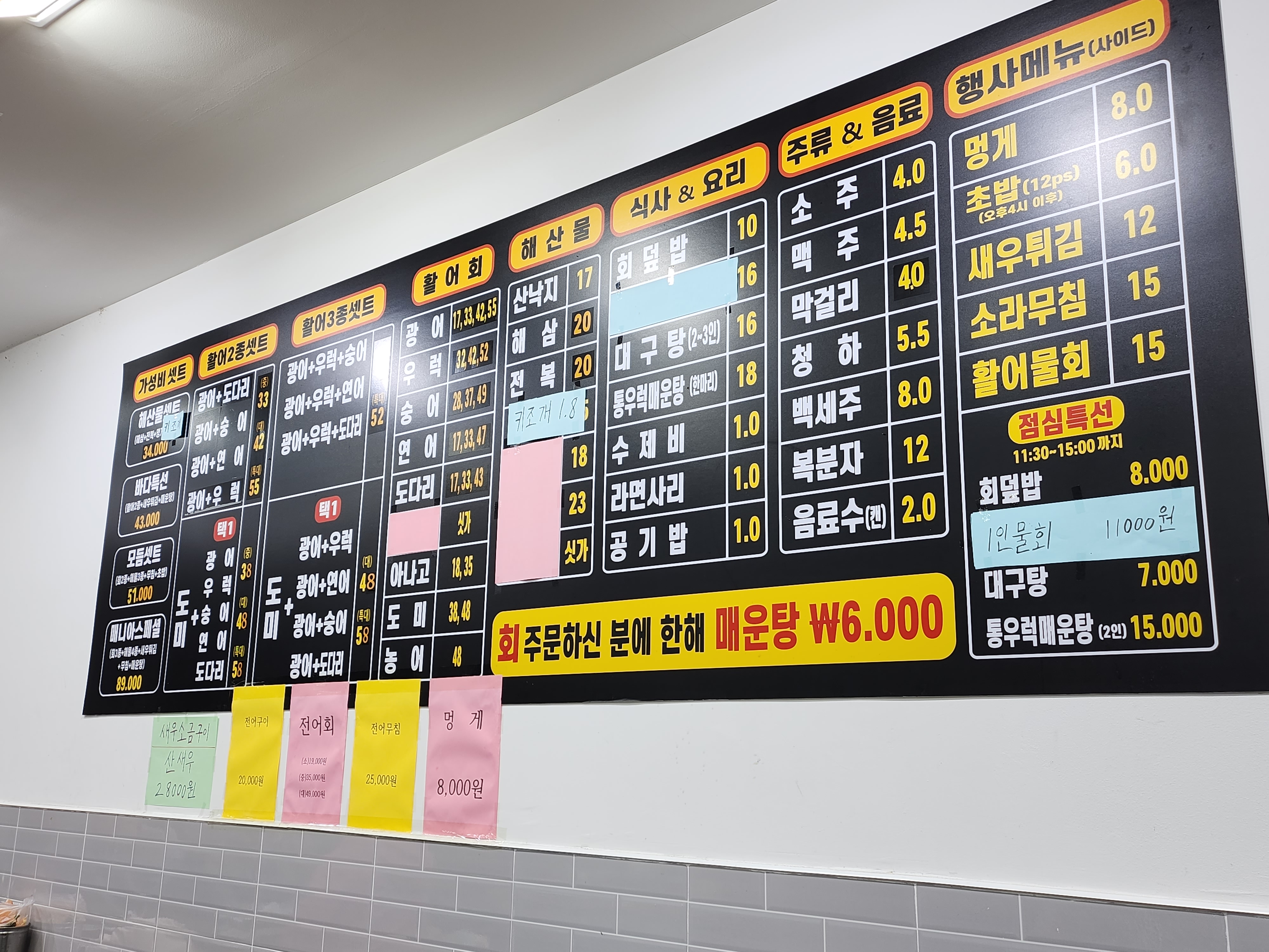 토요일 저녁 7시쯤 홍제종합어시장에 방문했다. 사람이 엄청 많았다. 간신히 한 테이블이 남아 있어서 웨이팅 없이 바로 착석할 수 있었다.