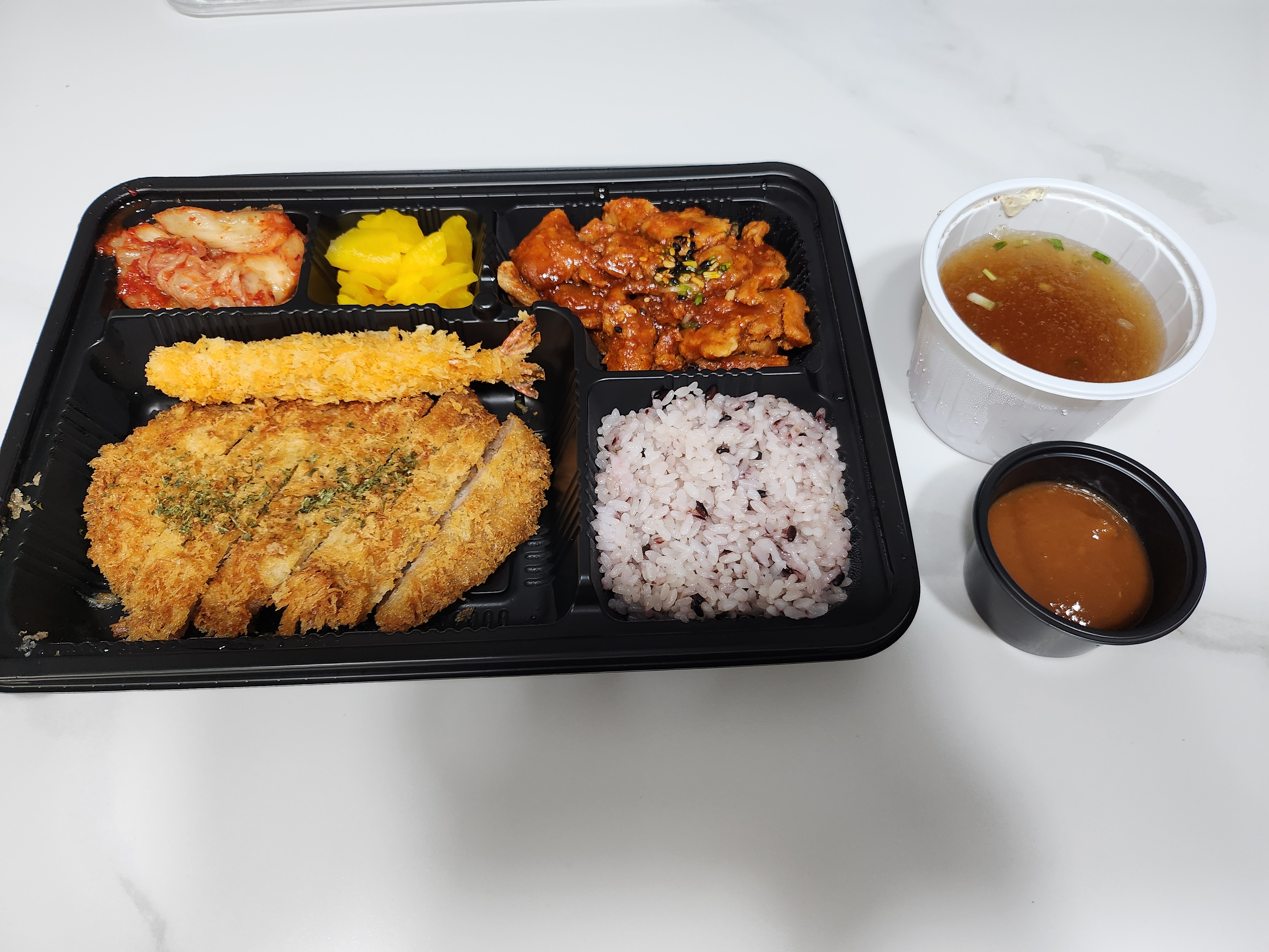 감동까스 최애 메뉴 제육돈까스. 가격은 13,900원이다. 주로 포장해서 먹는데 도톰한 돈까스에 새우튀김, 매콤 달달한 제육까지 푸짐하게 즐길 수 있어서 매우 좋아하는 메뉴이다. 소스도 따로 포장해 주시고 국물도 있어서 좋다.