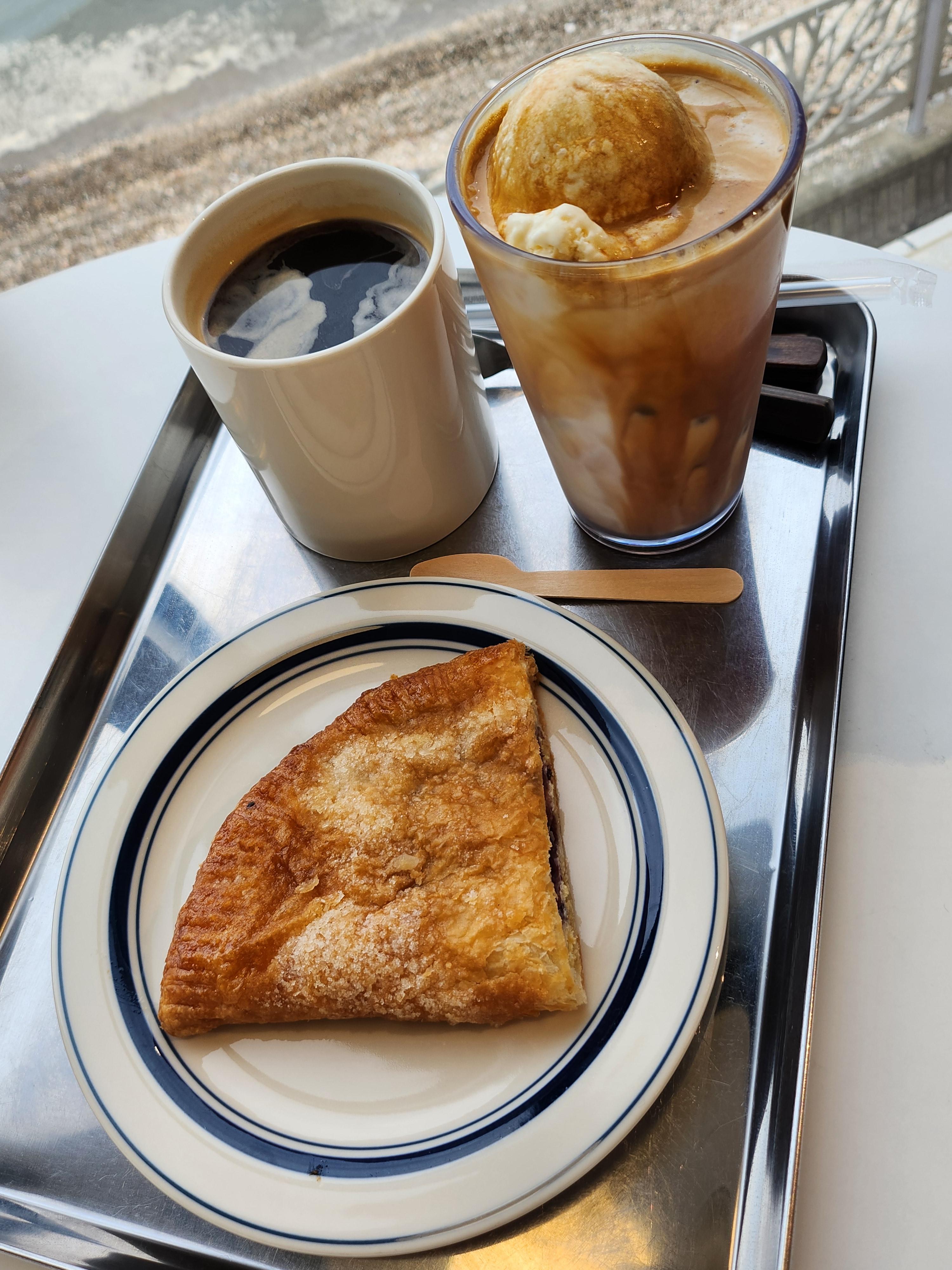 블루베리 파이랑 아메리카노, 라떼속 아이스크림이라는 메뉴를 시켰다.